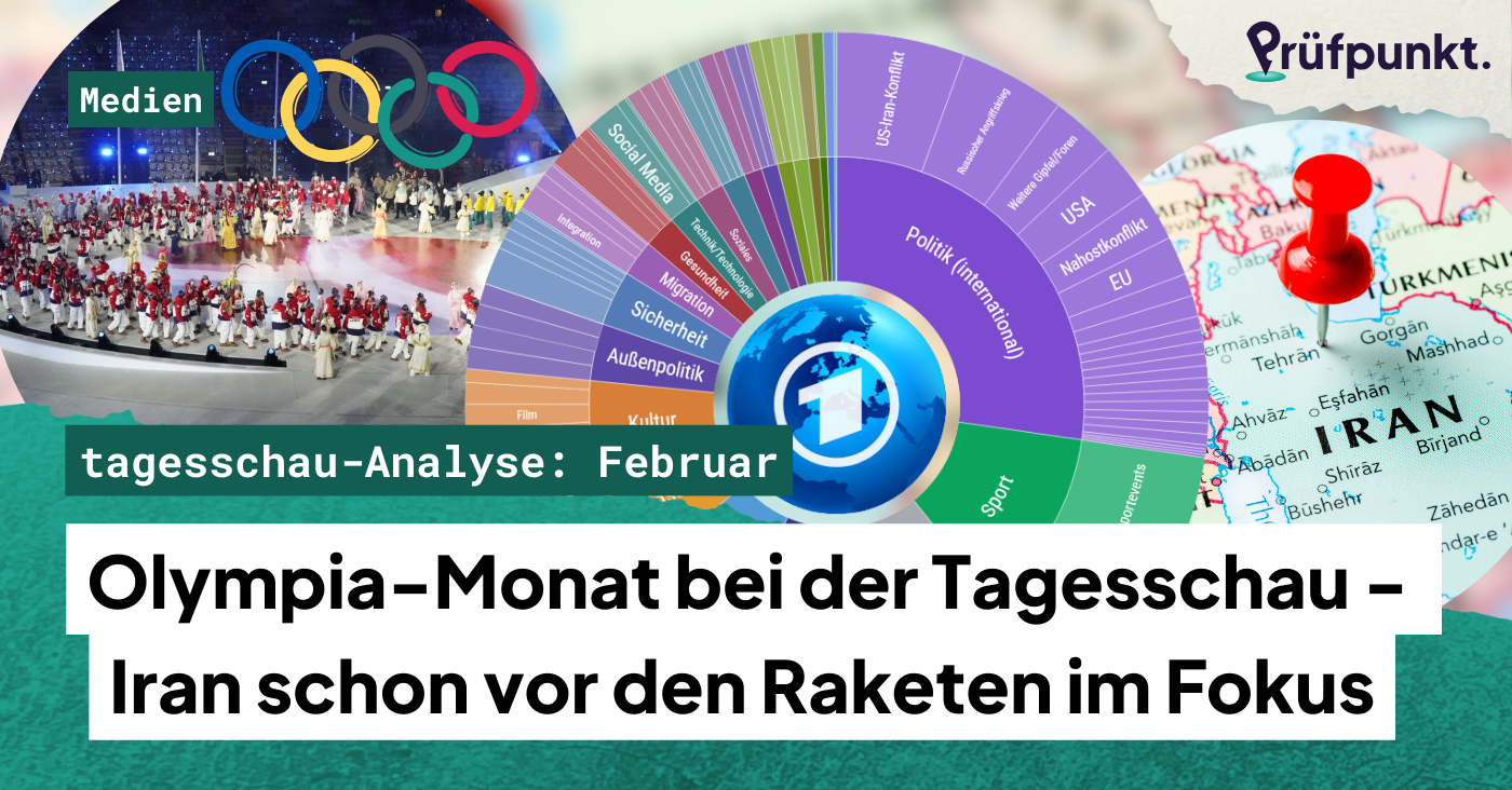 Im Februar war der Anteil von Sport in der Berichterstattung der Tagesschau so hoch wie in keinem der bislang analysierten Monate (seit Juli 2025). Es dominierte zwar weiterhin die internationale Politik (von 7 Stunden und 5 Minuten untersuchter Sendezeit nahm dieses Themenfeld 1:55 h ein, 27,3 % der gesamten Sendezeit), allerdings berichtete die Tagesschau auch mehr als 50 Minuten (12 %) über das Thema Sport. Der Hauptgrund dafür war die Berichterstattung zu den Olympischen Spielen in Italien. In der Prüfpunkt-Analyse führen wir sie unter der Kategorie "Großsportevents". Diese war im Februar das Einzelthema mit dem größten Anteil der Sendezeit (knapp 28 Minuten, 6,6 %). Dazu kamen noch regelmäßige Berichte zum Fußball (16 Minuten) und einzelne Beiträge zu anderen Sportarten wie Handball oder American Football.